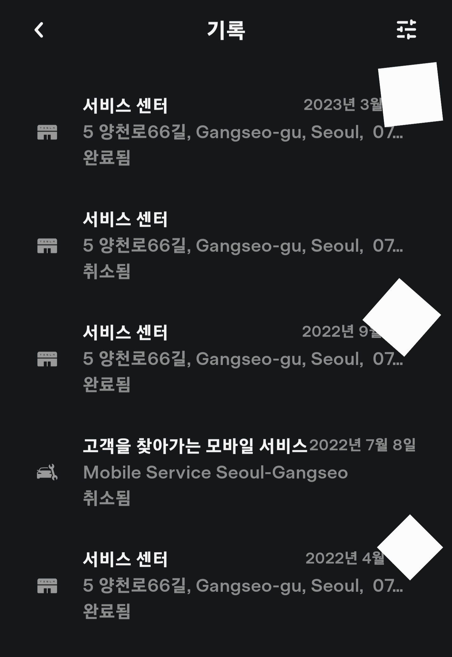 테슬라 앱에서 정비를 누르면